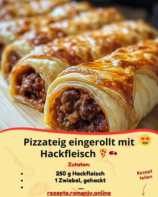 Zutaten:500 g Pizzateig (fertig oder selbstgemacht)300 g Hackfleisch (Rind oder gemischt)1 Zwiebel (fein gehackt)1 Knoblauchzehe (gehackt)100 g geriebener Käse200 ml passierte Tomaten1 TL OreganoSalz und Pfeffer1 EL Olivenöl Zubereitung: Das Rezept wird auf der nächsten Seite fortgesetz
