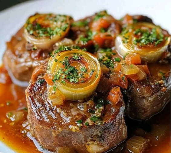 Zutaten:1 Zwiebel, gehackt1 Lorbeerblatt1 Zweig Thymian4 Scheiben Kalbshaxe2 Karotten, in Scheiben geschnitten 2 Stangen Sellerie, in kleine Stückegeschnitten 3 Knoblauchzehen, gehackt400 g zerdrückte Tomaten250 ml Hühnerbrühe2 EL Olivenöl1 EL MehlSalz und Pfeffer nach Geschmack Fortsetzung auf der nächsten Seite