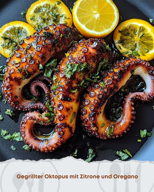_____Zutaten:_____ – 900 g frische Kraken-Tentakel – 3 Esslöffel natives Olivenöl extra, geteilt – 2 Zitronen – 2 Teelöffel schwarzer Pfeffer – 1 Esslöffel frisch gehackter oder getrockneter Oregano – 2 Teelöffel koscheres Salz Fortsetzung auf der nächsten Seite