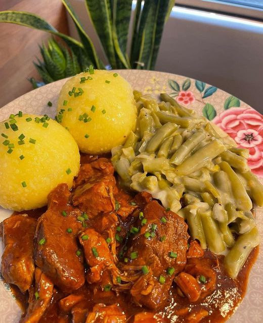 Zutaten: 500 g Rindergulasch 2 Zwiebeln, gewürfelt 2 Knoblauchzehen, gehackt 2 EL Tomatenmark 2 EL Paprikapulver (edelsüß) 500 ml Rinderbrühe Salz und Pfeffer nach Geschmack 4-6 Kartoffelklöße (aus dem Supermarkt oder selbstgemacht) 500 g grüne Bohnen, geputzt und in Stücke geschnitten 2 EL Öl zum Braten