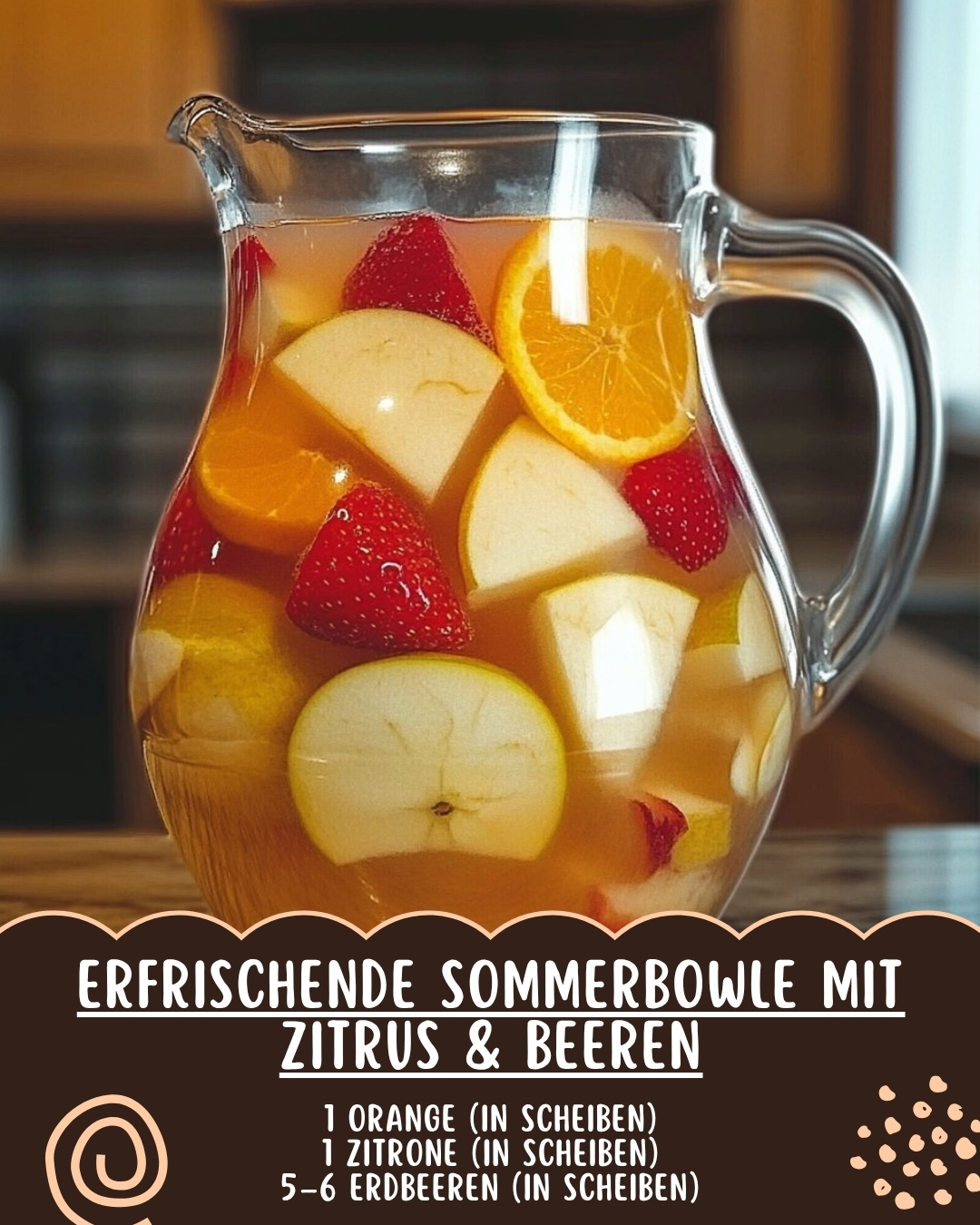 Zutaten1 Orange, in Scheiben geschnitten1 Zitrone, in Scheiben geschnitten5–6 Erdbeeren, in Scheiben geschnitten1 Apfel, gewürfelt1 Liter Apfelsaft oder Traubensaft500 ml Mineralwasser (mit oder ohne Kohlensäure)EiswürfelOptional: einige Blätter frische Minze, etwas Limettensaft oder ein Spritzer HolundersirupZubereitung