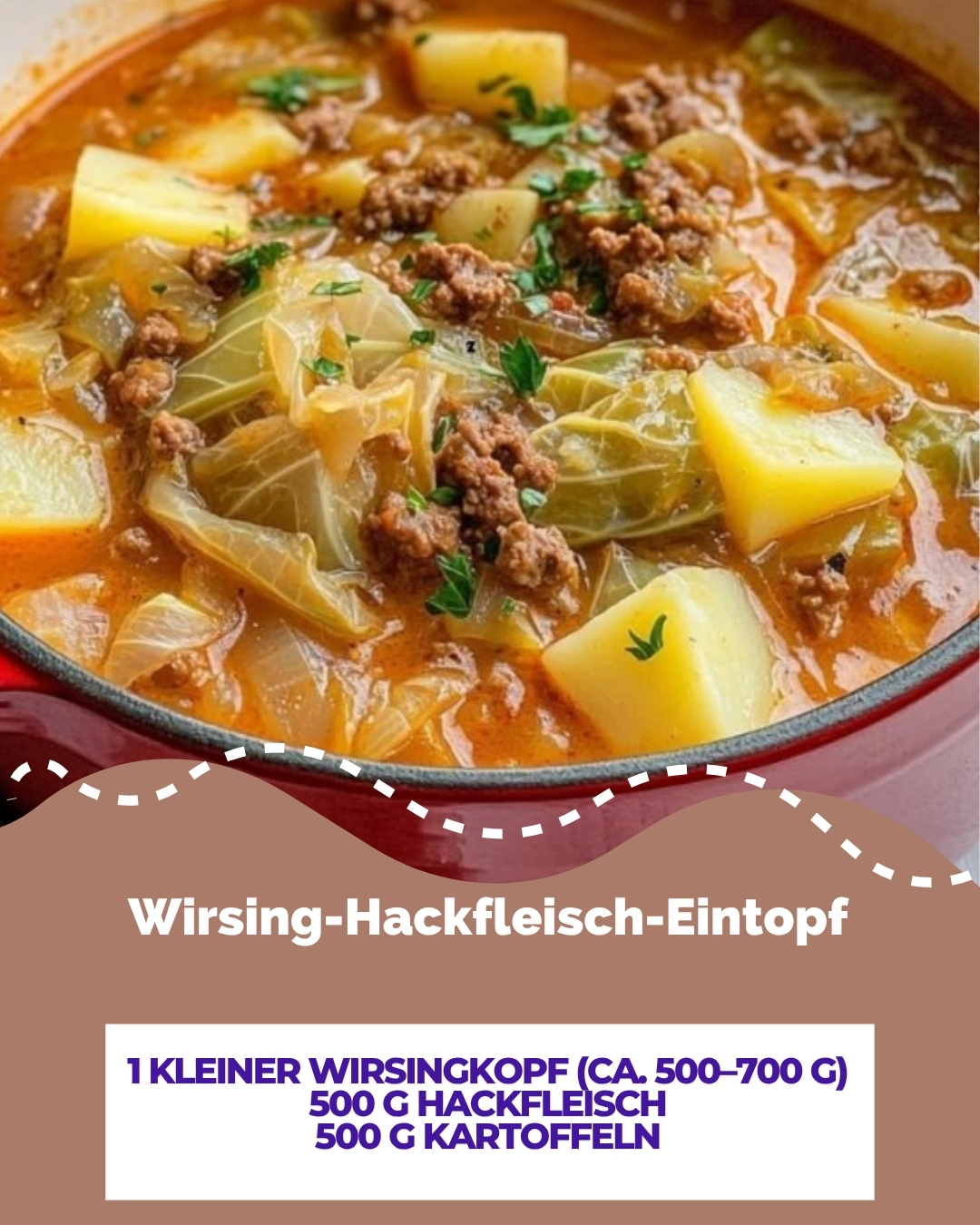 Zutaten1 kleiner Wirsingkopf (ca. 500–700 g)500 g Hackfleisch500 g Kartoffeln1 rote Zwiebel1–2 KnoblauchzehenGesundes Öl zum AnbratenWasser oder Brühe nach BedarfSalz und Pfeffer zum WürzenZubereitung