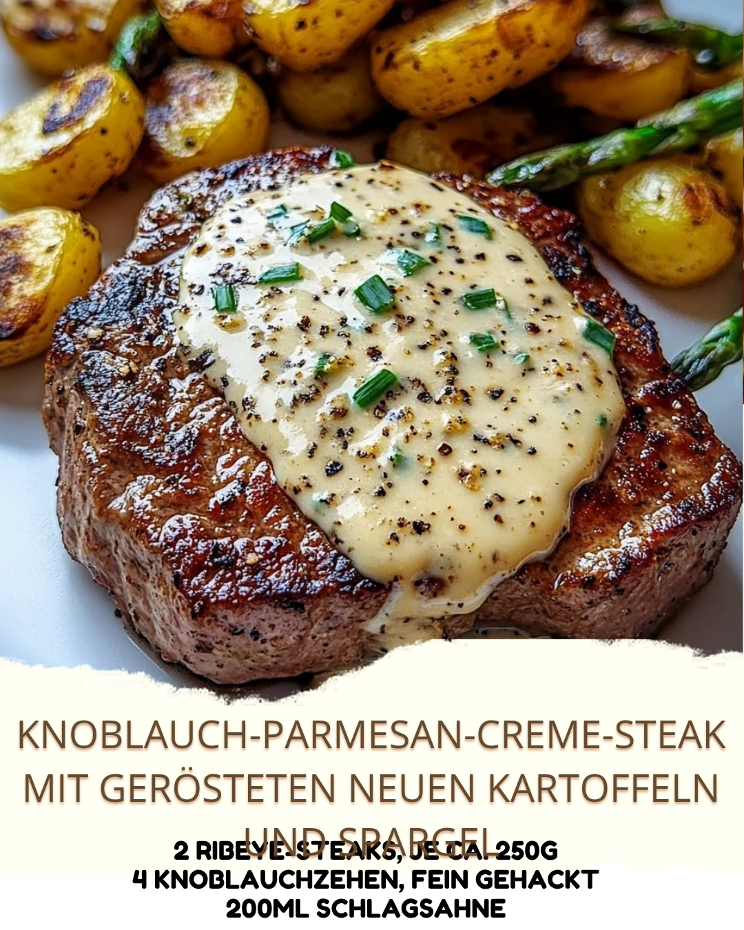 Zutaten2 Ribeye-Steaks, je ca. 250g4 Knoblauchzehen, fein gehackt200 ml SchlagsahneNeue KartoffelnSpargelOlivenölSalzPfefferParmesan (optional)Zubereitung