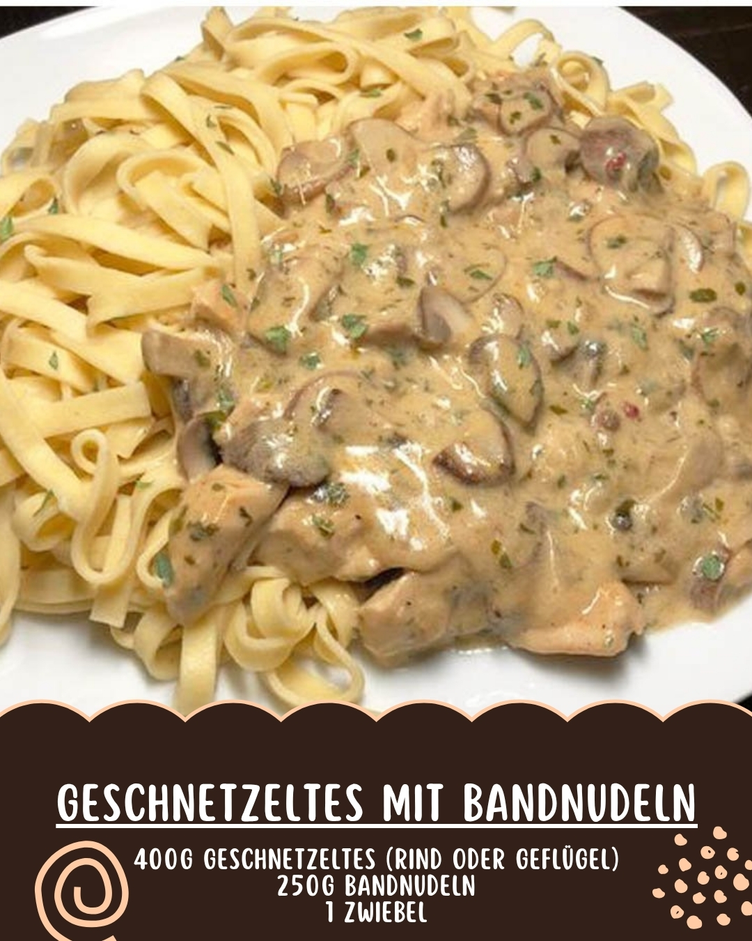Zutaten400g Geschnetzeltes (Rind oder Geflügel)250g Bandnudeln1 Zwiebel2 Knoblauchzehen200ml Sahne200ml Brühe2 EL ÖlSalzPfefferPetersilie zum GarnierenZubereitung