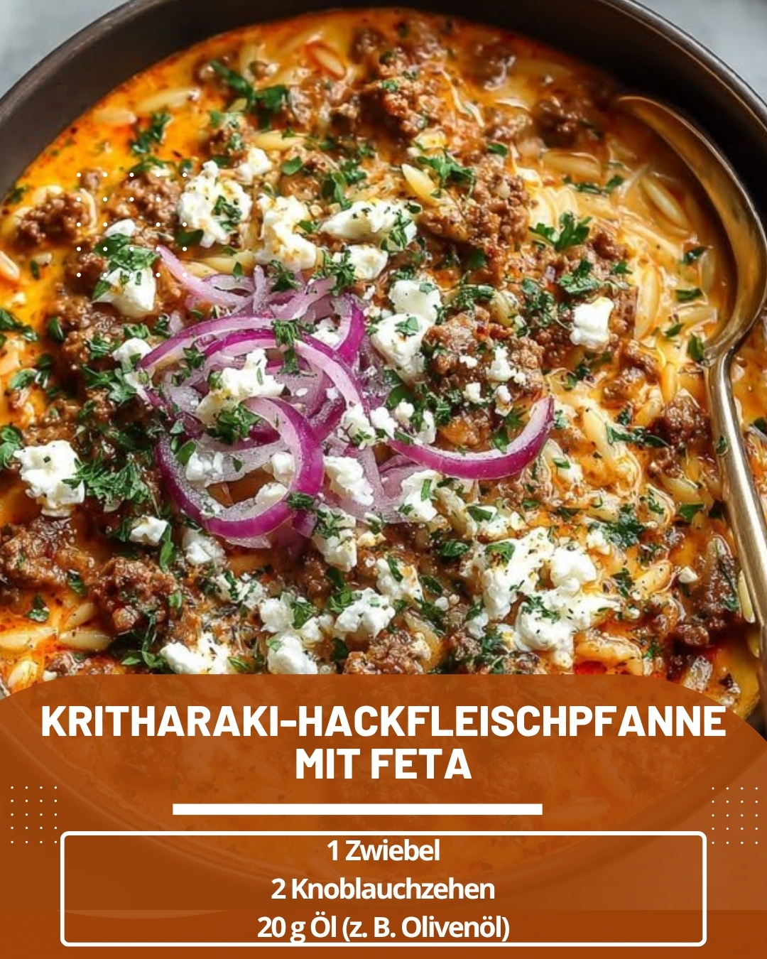 Zutaten1 Zwiebel2 Knoblauchzehen20 g Öl (zum Beispiel Olivenöl)500 g Rinderhackfleisch300 g Kritharaki750 ml Gemüsebrühe200 g FetaSalz und Pfeffer nach GeschmackFrische Kräuter (zum Beispiel Petersilie) zum GarnierenZubereitung