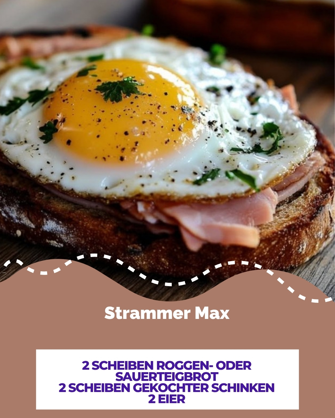 Strammer MaxZutaten2 Scheiben Roggen- oder Sauerteigbrot2 Scheiben gekochter Schinken2 Eier1 Esslöffel ButterFrische Petersilie, gehacktSalz und PfefferZubereitung