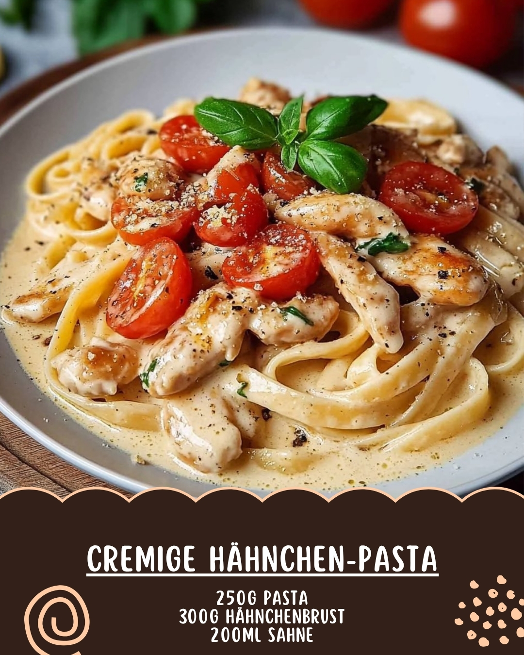 Zutaten250g Pasta300g Hähnchenbrust200ml Sahne100g Parmesan2 Knoblauchzehen1 ZwiebelSalzPfefferOlivenölPetersilie (zum Garnieren)Zubereitung