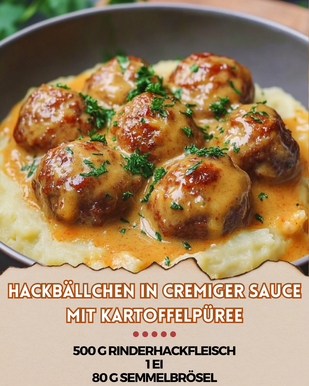 Hackbällchen in cremiger Sauce mit Kartoffelpüree Zutaten 500 g Rinderhackfleisch 1 Ei 80 g Semmelbrösel 1 TL Paprika edelsüß 1,5 TL Salz 1 TL schwarzer Pfeffer Zutaten für die cremige Sauce (z. B. Sahne, etwas Brühe, Gewürze nach Geschmack) Kartoffeln für das Püree Milch oder Sahne für das Püree Butter für das Püree Zubereitung