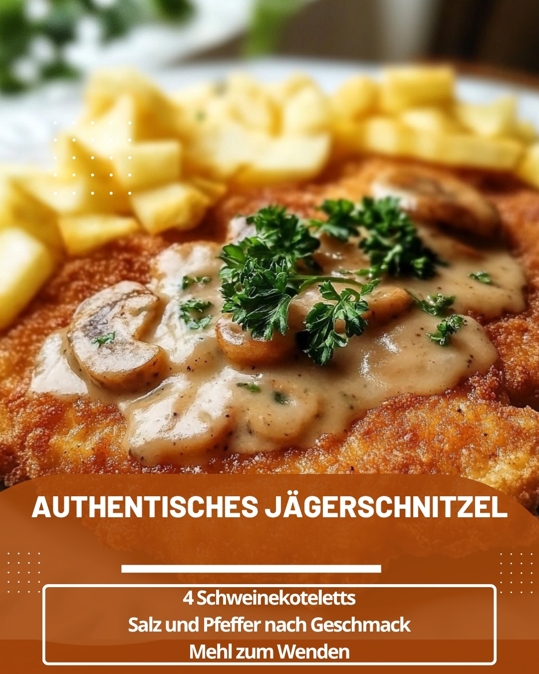 Zutaten4 SchweinekotelettsSalz und Pfeffer nach GeschmackMehl zum Wenden2 EierPaniermehl2 EL Butterschmalz oder Öl200 g Champignons, in Scheiben geschnitten1 Zwiebel, gehackt200 ml Sahne200 ml Brühe1 TL Petersilie, gehacktZubereitung