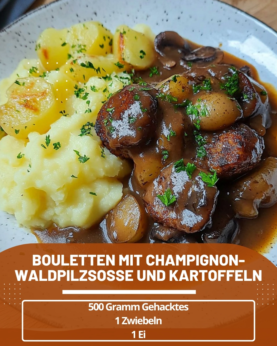 Bouletten mit Champignon-Waldpilzsoße und KartoffelnZutaten500 Gramm Gehacktes1 Zwiebel1 Ei1 Brötchen (eingeweicht)SalzPfefferPaprikapulver (edelsüß)KurkumaPetersilieeine kleine Tasse eingeweichte Waldpilze200 Gramm Champignonseine kleine Zwiebel250 ml BratensaftSoßenbinderZubereitung