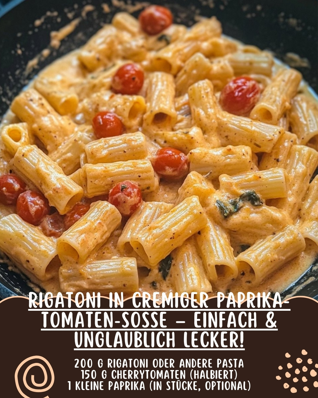 Zutaten200 g Rigatoni oder andere Pasta150 g Cherrytomaten, halbiert1 kleine Paprika, in Stücke geschnitten (optional)150 ml Sahne oder Kochsahne1 EL Tomatenmark1 TL Paprikapulver edelsüß1 TL Butter oder OlivenölSalz und PfefferFrische Petersilie zum GarnierenZubereitung