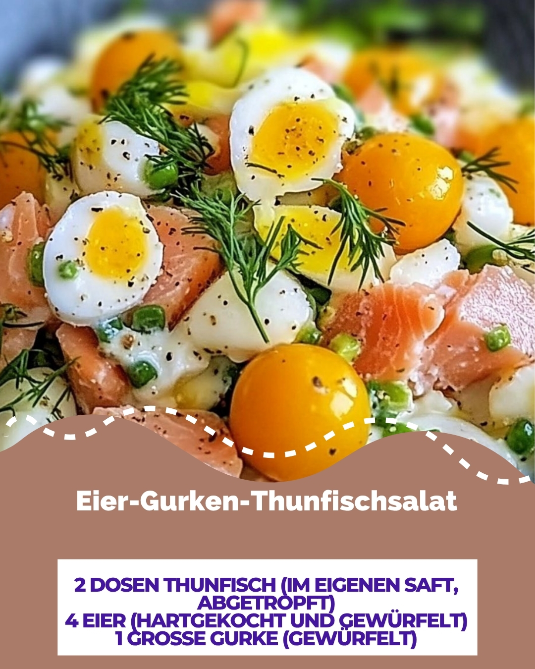 Eier-Gurken-ThunfischsalatZutaten2 Dosen Thunfisch (im eigenen Saft, abgetropft)4 Eier (hartgekocht und gewürfelt)1 große Gurke (gewürfelt)1 kleine Zwiebel (fein gehackt)150 g Joghurt (natur)2 EL Mayonnaise1 TL SenfSalz und Pfeffer nach GeschmackFrischer Dill (gehackt, zum Garnieren)Zubereitung