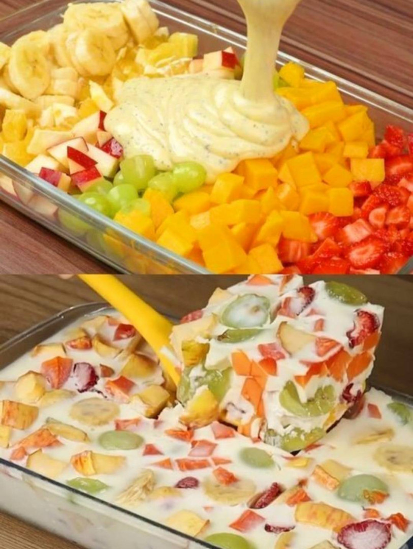 Zutaten: ◾️1 Banane, in Scheiben geschnitten ◾️1 Apfel, gewürfelt ◾️1 Tasse Trauben (grün oder rot), halbiert ◾️1 Tasse Mango, gewürfelt ◾️1 Tasse Erdbeeren, gehackt ◾️1/2 Tasse gezuckerte Kondensmilch ◾️1/2 Tasse Sahne (Sahne oder Schlagsahne) ◾️1/2 Teelöffel Vanilleextrakt (optional) Anweisungen: Lesen Sie mehr auf der nächsten Seite >>