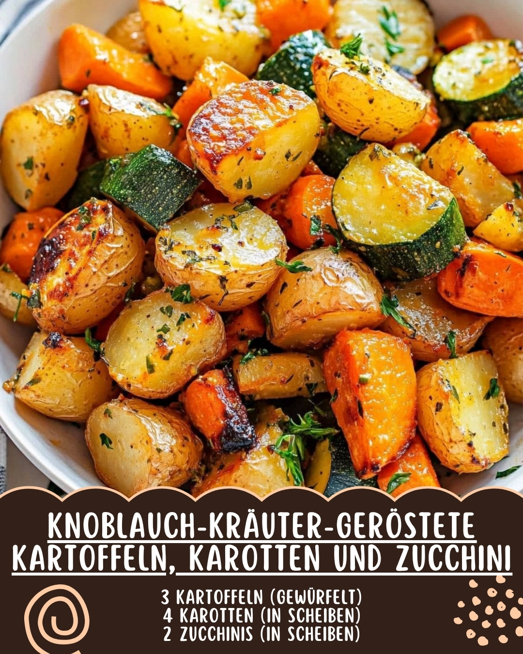 Zutaten3 Kartoffeln, gewürfelt4 Karotten, in Scheiben geschnitten2 Zucchinis, in Scheiben geschnitten3 EL Olivenöl4 Knoblauchzehen, fein gehackt1 TL Thymian1 TL Rosmarin1/2 TL OreganoSalzPfefferOptional: etwas frische Petersilie zum GarnierenZubereitung