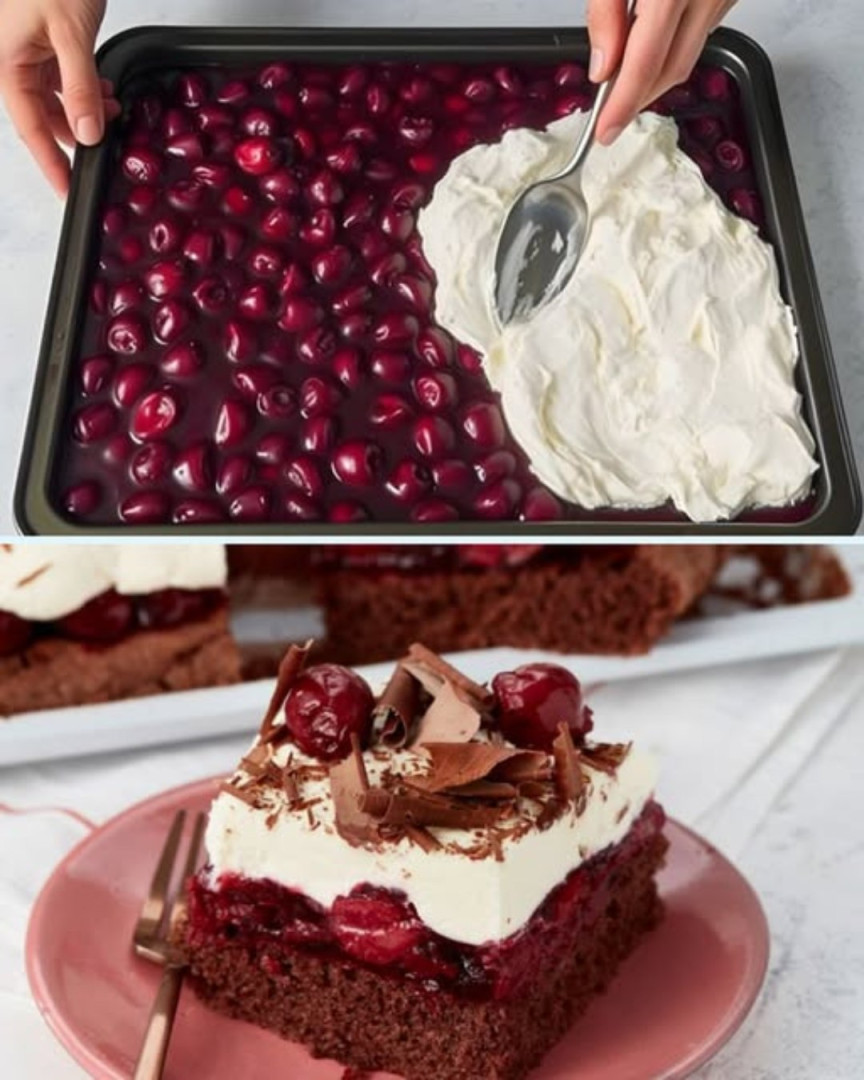 3 Pck. Schokoladenpuddingpulver 3 Pck. Vanillepuddingpulver 5 Ei(er) 1 Tasse Zucker 1 Tasse Sonnenblumenöl 1 Pck. Backpulver 2 Gläser Schattenmorellen, oder Sauerkirschen 4 Becher Schlagsahne 2 Pck. Vanillezucker 3 Pck. Sahnesteif einige Schokoladenraspel