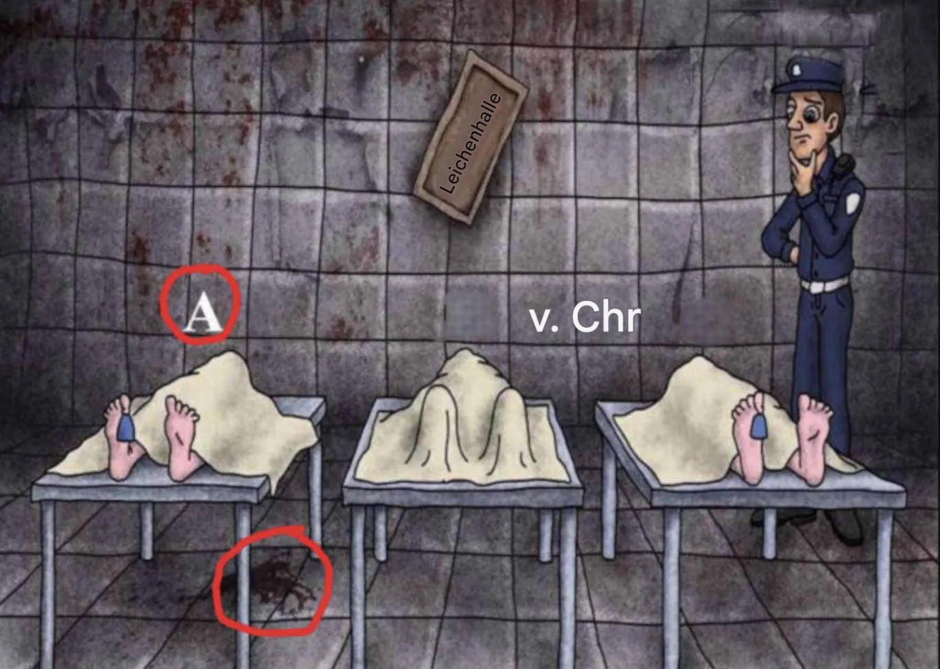 Person A ist die Einzige, die noch lebt. Warum? Ein winziger Fleck auf dem Boden unter dem Tisch zeugt von Aktivität … von Leben. Dieser kleine Fleck ist nicht dramatisch: Er deutet lediglich darauf hin, dass die Blutzirkulation noch funktioniert. Kurz gesagt, etwas Unscheinbares, aber Reales geschieht – ein Zeichen, das nicht existiert, wenn alles inaktiv ist. Unsere Intuition verbindet diesen Fleck normalerweise mit schlechten Nachrichten; hier ist er genau das Gegenteil: Er ist der Beweis dafür, dass der Körper noch aktiv ist.